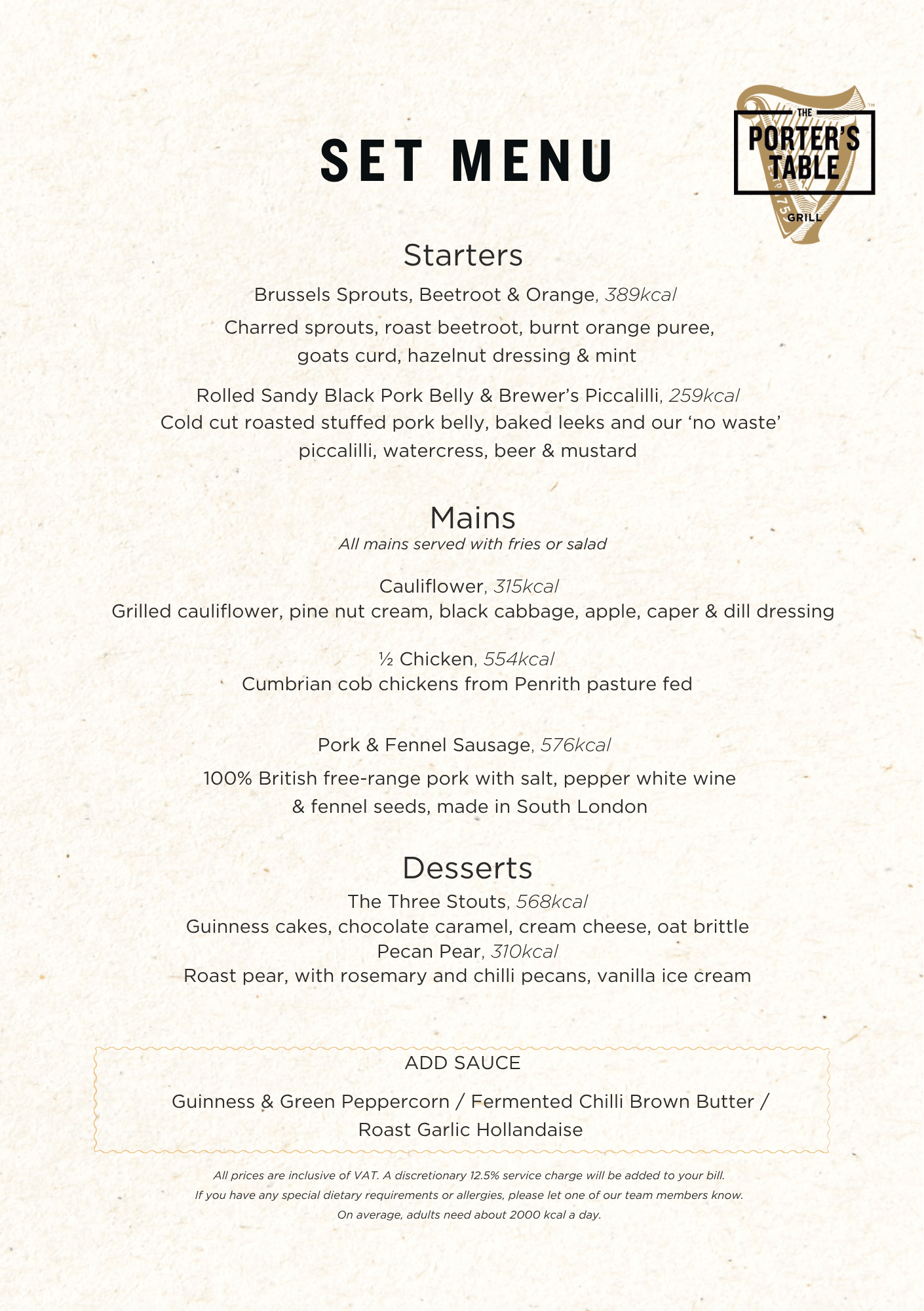 As the menu at The Porter's Table evolves with the seasons, we kindly ask that you contact our team at eat@guinnessopengatelondon.com for the most up-to-date allergen information ahead of your visit.